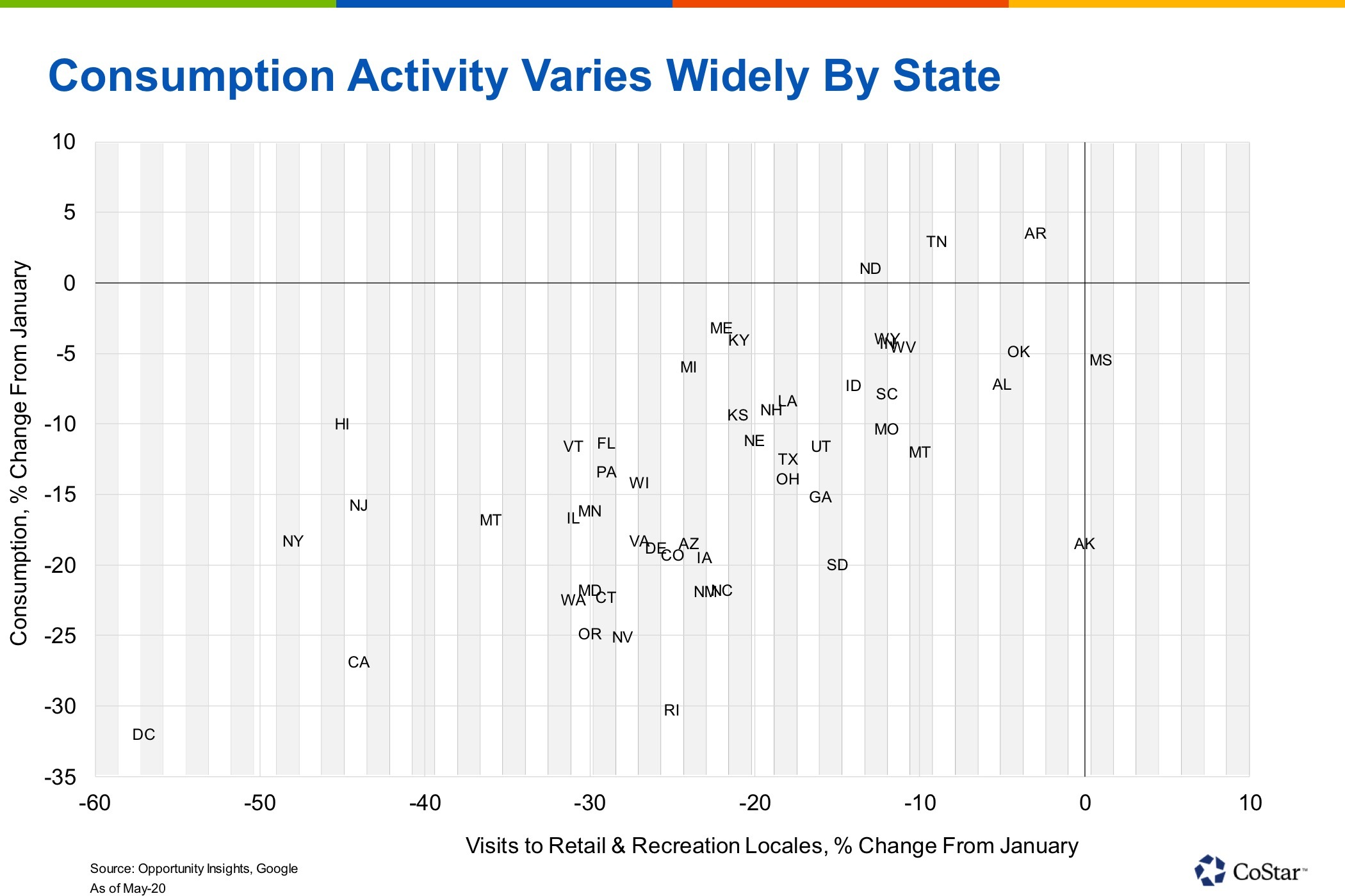 The fast-moving nature of this crisis has forced us to look outside the typical government data sources for more high-frequency data, and we have discovered a treasure trove of new data from alternative data sources that will help us analyze the various regional differences, and do it in nearly real time. Utilizing new data from the Harvard-based research and analytics shop Opportunity Insights and Google, we can shed light on the vast difference in activity across the U.S. The following chart shows the change in consumer spending year to date by state, using Opportunity Insight’s data gathered from credit cards, payrolls and other providers. We plot that against Google’s mobility index for retail and recreation locations, a measure of daily visits. We said before that there are sharp differences across states, and this chart does a great job of proving that point.